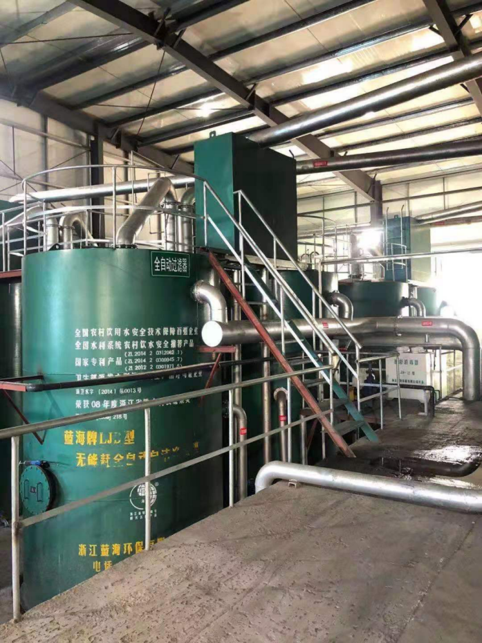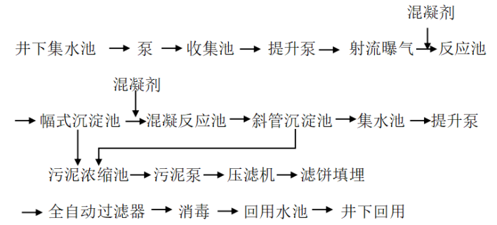 流程說明:井下各工作面礦井水用泵送到地上的收集池,收集池到中液位后用泵提升到地面的凈水設(shè)施,地下礦井水在進(jìn)地面池前先經(jīng)射流曝氣,再經(jīng)混凝、幅流式沉淀,出水再進(jìn)入混凝反應(yīng)池、斜管沉淀池,出水流入集水池,用泵再提升到全自動無閥濾池,出水經(jīng)消毒后自流入回用水池,大部份去井下回用,部份用泵送去道路灑水。沉淀污泥排入污泥濃縮池,用污泥泵抽至壓濾設(shè)備處理后的污泥外運,上清液回流到調(diào)節(jié)池進(jìn)行再處理。濾池反沖水經(jīng)收集后用泵抽回到前面的幅流式沉淀池中。